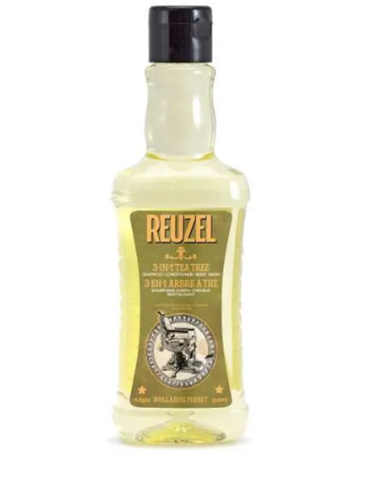 מוצר עץ התה 3 ב-1 של REUZEL משמש כשמפו, מרכך, וסבון לכל הגוף.